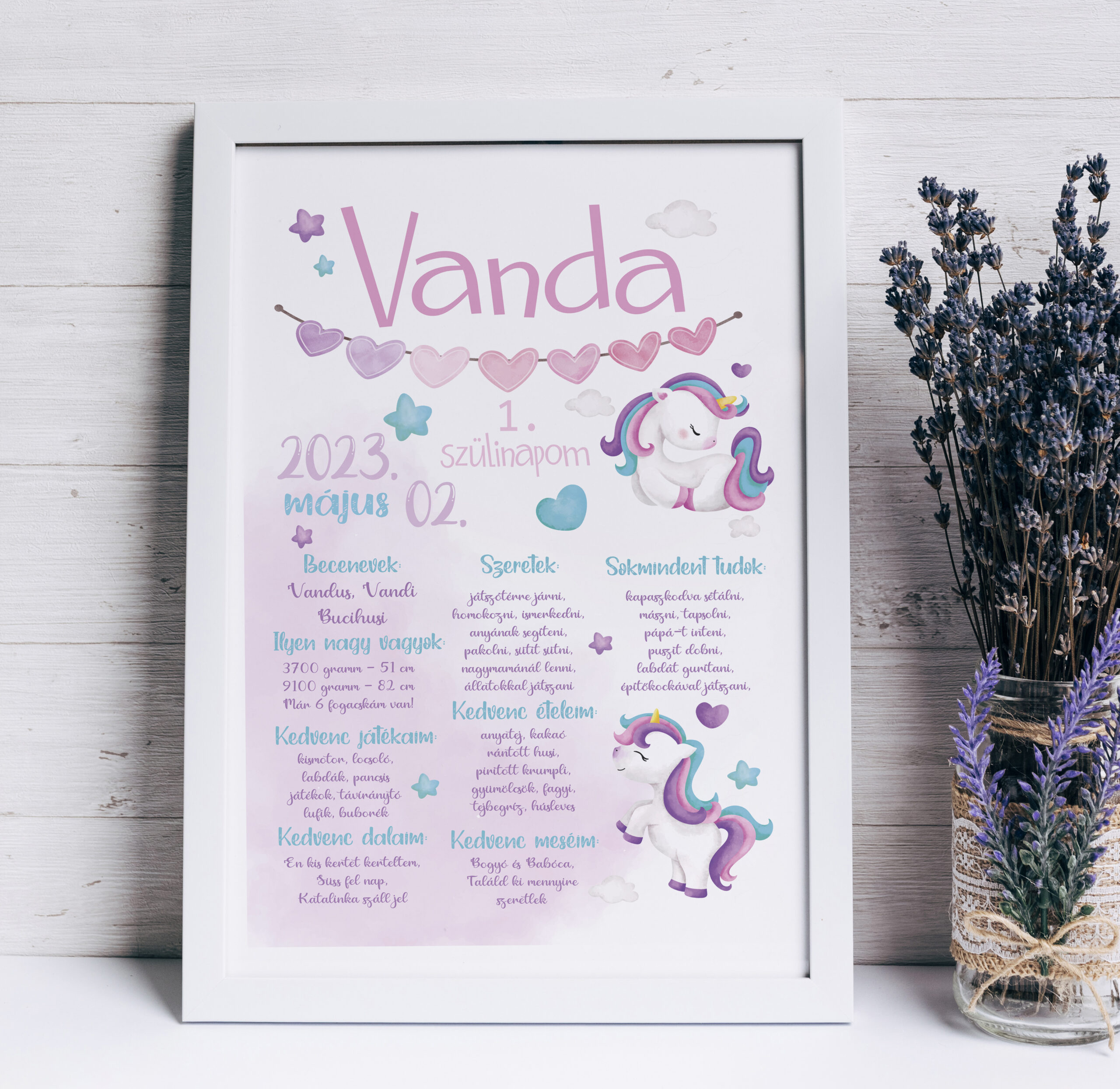 Minden alkotásunkat úgy terveztük meg, hogy minden fontos emlék helyet kapjon rajta: a pontos születési idő, a súly, a hossz és természetesen a baba neve is. A széles választéknak köszönhetően különböző témák és stílusok közül válogathatsz – a letisztult skandináv stílustól a vidám állatfigurás grafikákon át a modern minimálig, így biztosan megtalálod a gyerekszoba hangulatához illő designt.