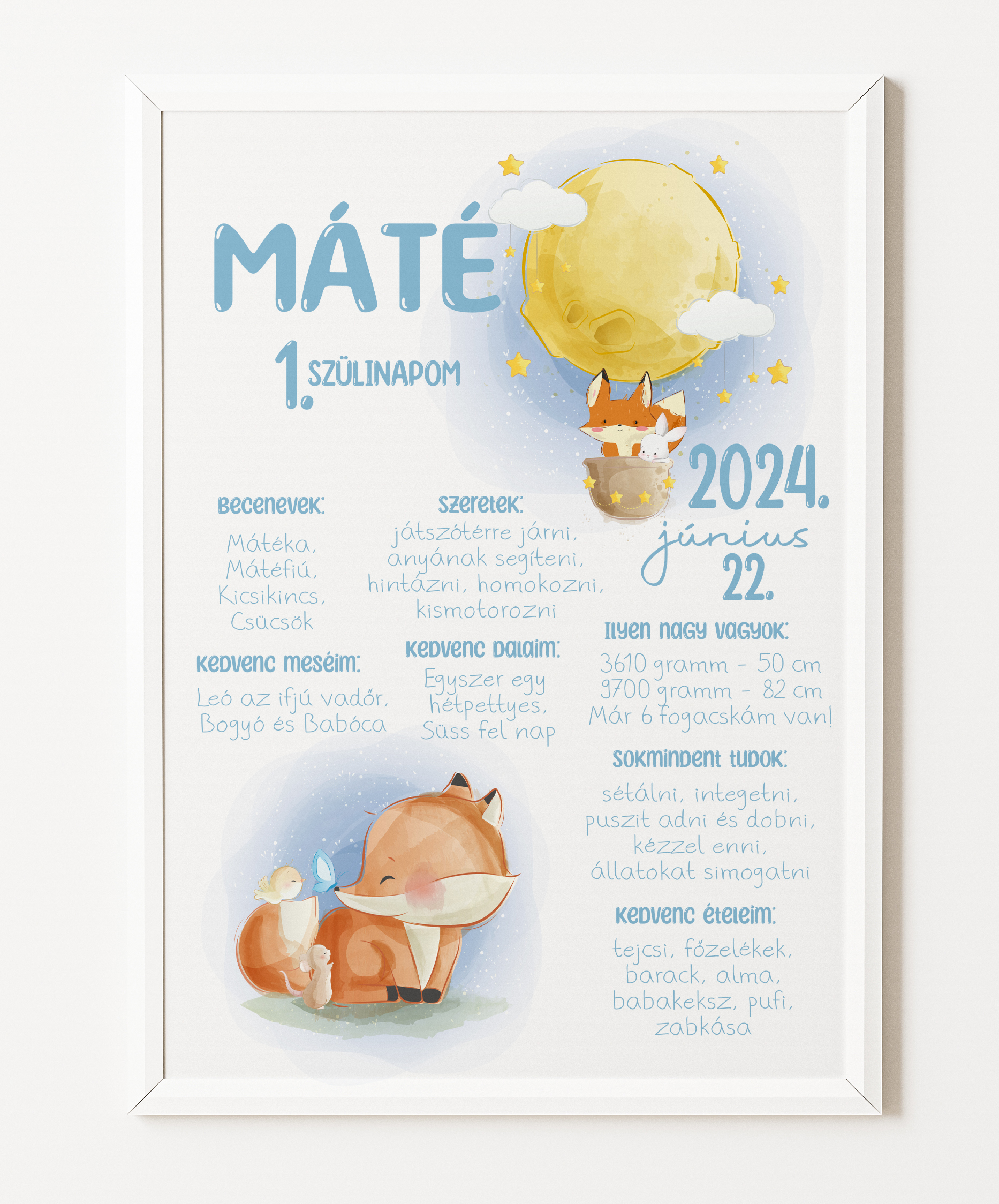 Minden alkotásunkat úgy terveztük meg, hogy minden fontos emlék helyet kapjon rajta: a pontos születési idő, a súly, a hossz és természetesen a baba neve is. A széles választéknak köszönhetően különböző témák és stílusok közül válogathatsz – a letisztult skandináv stílustól a vidám állatfigurás grafikákon át a modern minimálig, így biztosan megtalálod a gyerekszoba hangulatához illő designt.