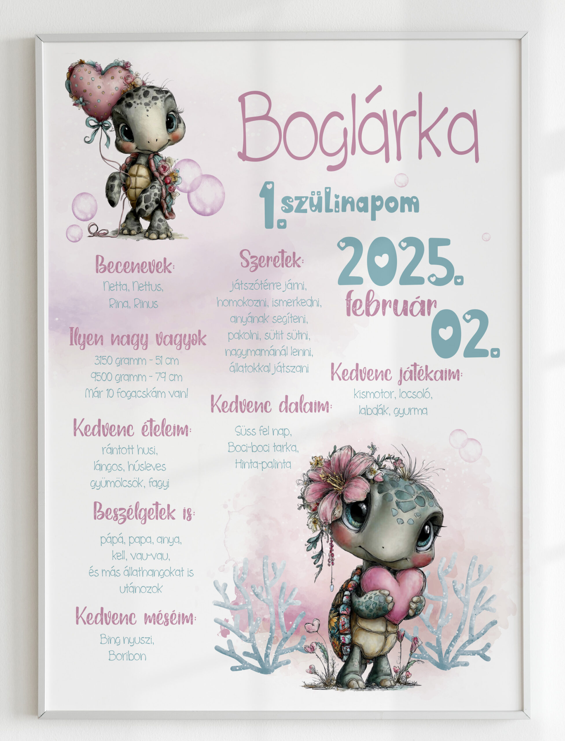 Minden alkotásunkat úgy terveztük meg, hogy minden fontos emlék helyet kapjon rajta: a pontos születési idő, a súly, a hossz és természetesen a baba neve is. A széles választéknak köszönhetően különböző témák és stílusok közül válogathatsz – a letisztult skandináv stílustól a vidám állatfigurás grafikákon át a modern minimálig, így biztosan megtalálod a gyerekszoba hangulatához illő designt.